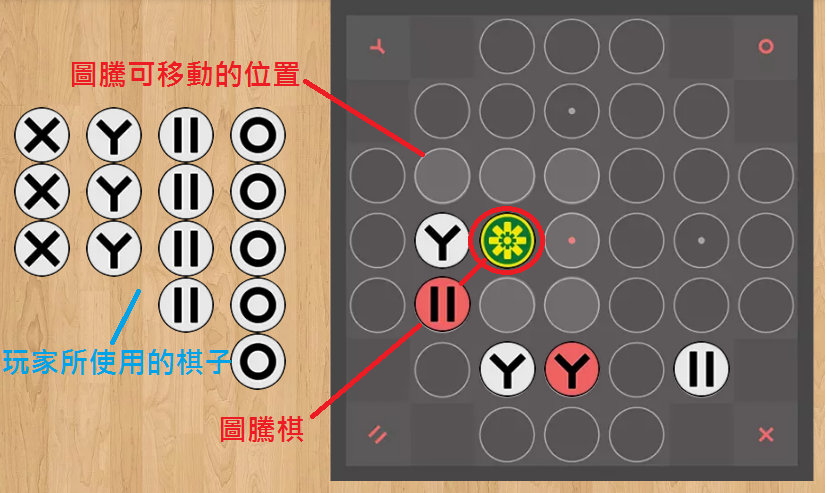 2. 棋子放置階段:在與圖騰棋相鄰的空格內放一枚自己的棋子;若圖騰棋周遭沒有空格,則改為在棋盤上的任一空格內放一枚自己的棋子。
